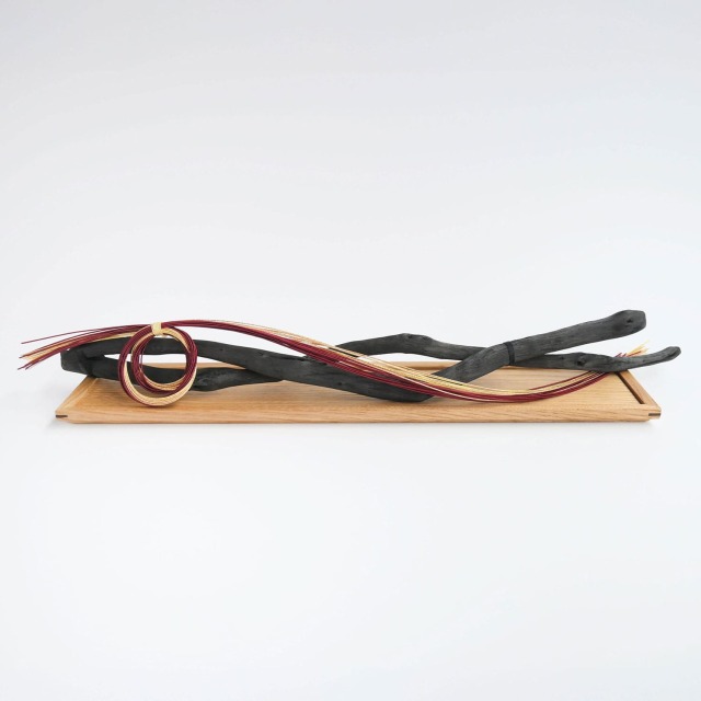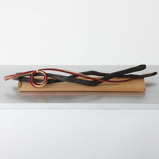 表情豊かな栗の木目と、流れるような曲線が美しい備長炭を組み合わせ、お正月の水引飾りを添えました。