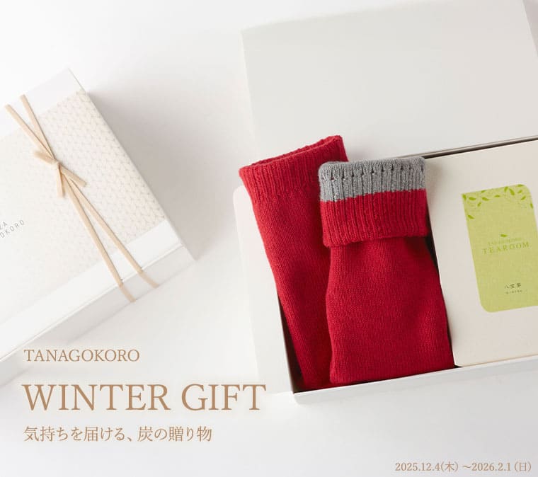 表側には超長綿とカシミヤ、内側には備長炭繊維とオーガニックコットンを組み合わせた糸で編み上げたルームソックスに、冬に嬉しいあたたかさと、おうち時間を心地よく過ごせるアイテムを組み合わせました。